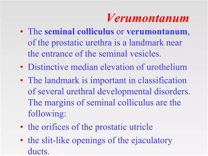 The seminal colliculus (Latin colliculus seminalis), or verumontanum, of the prostatic urethra is a landmark distal to the entrance of the ejaculatory ducts (on both sides, corresponding vas deferens and seminal vesicle feed into corresponding ejaculatory duct).